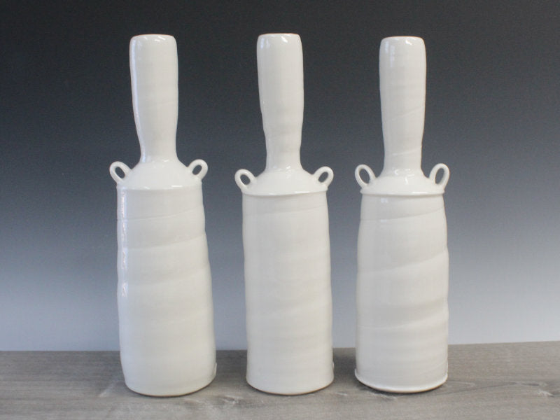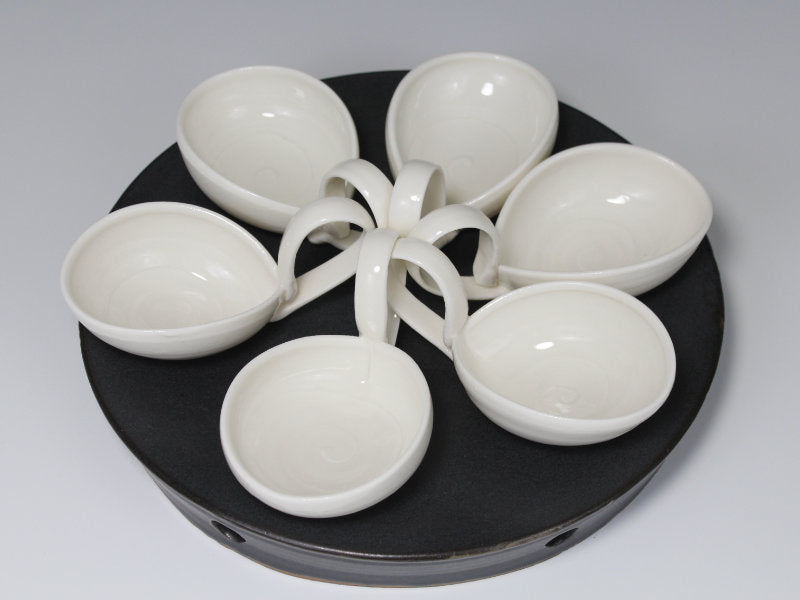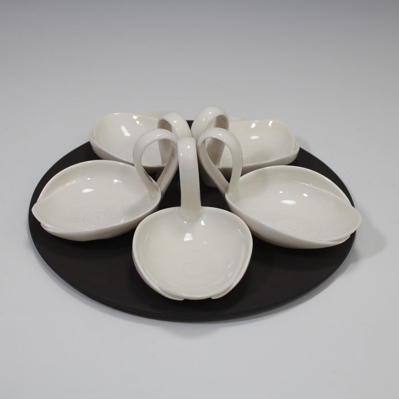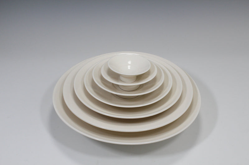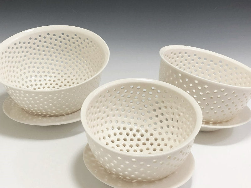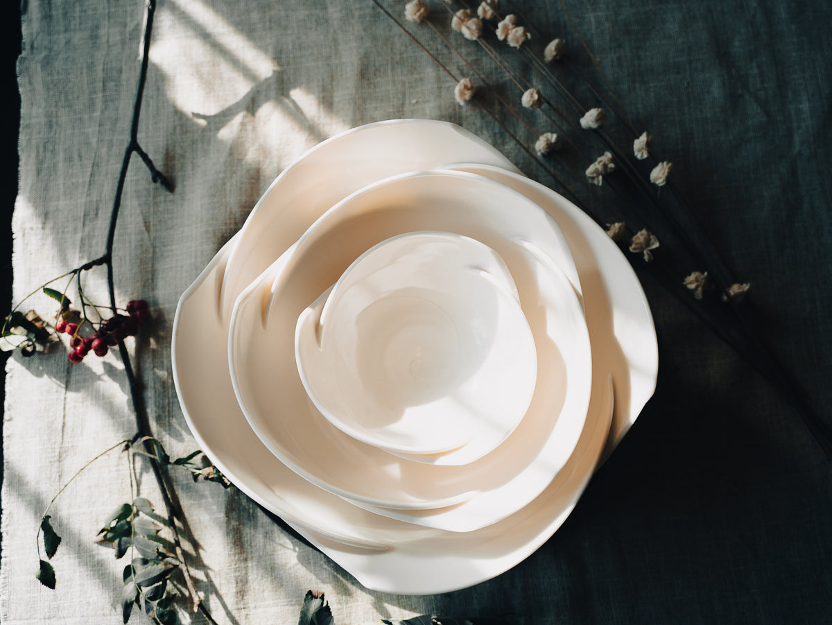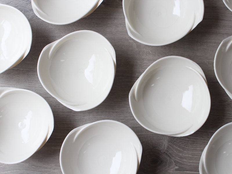 I am always taken by the beauty of porcelain when I open the kiln. It has a natural translucency and a warm and gentle white hue when the light pours over it. The pieces are versatile and sure to brighten up your dinner table.